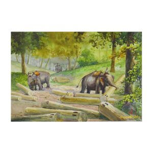 Burmese elephants from the timber industry – Artwork by Tin Mya