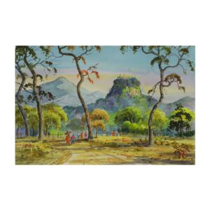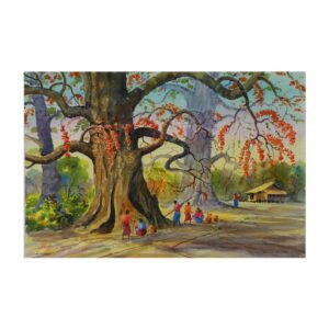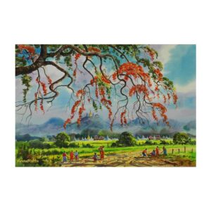 Picking the flowers under the palm tree of the village entrance – Artwork by Saw Tint Wai