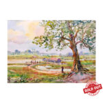 Title : A Boat Landing among Acacia Trees and Huts
