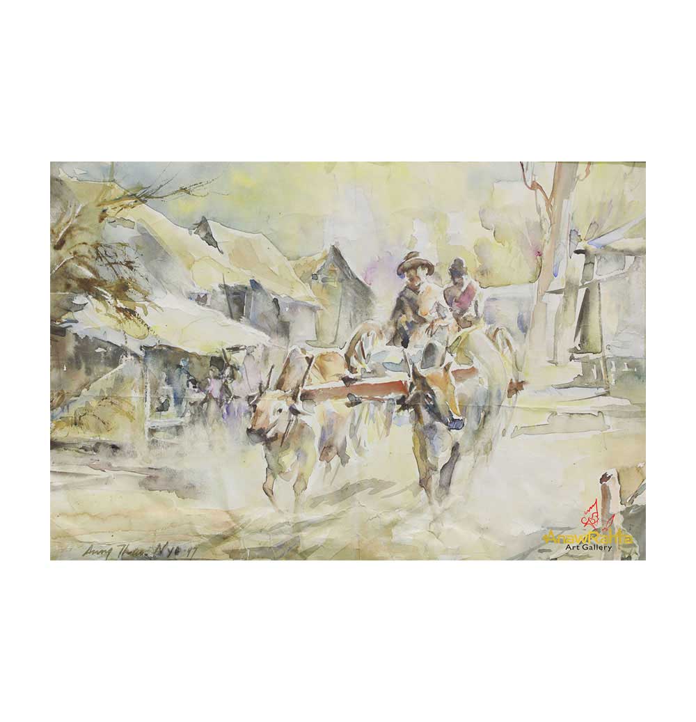 Bullock Cart and the road of village – Artwork by Aung Than Nyo
